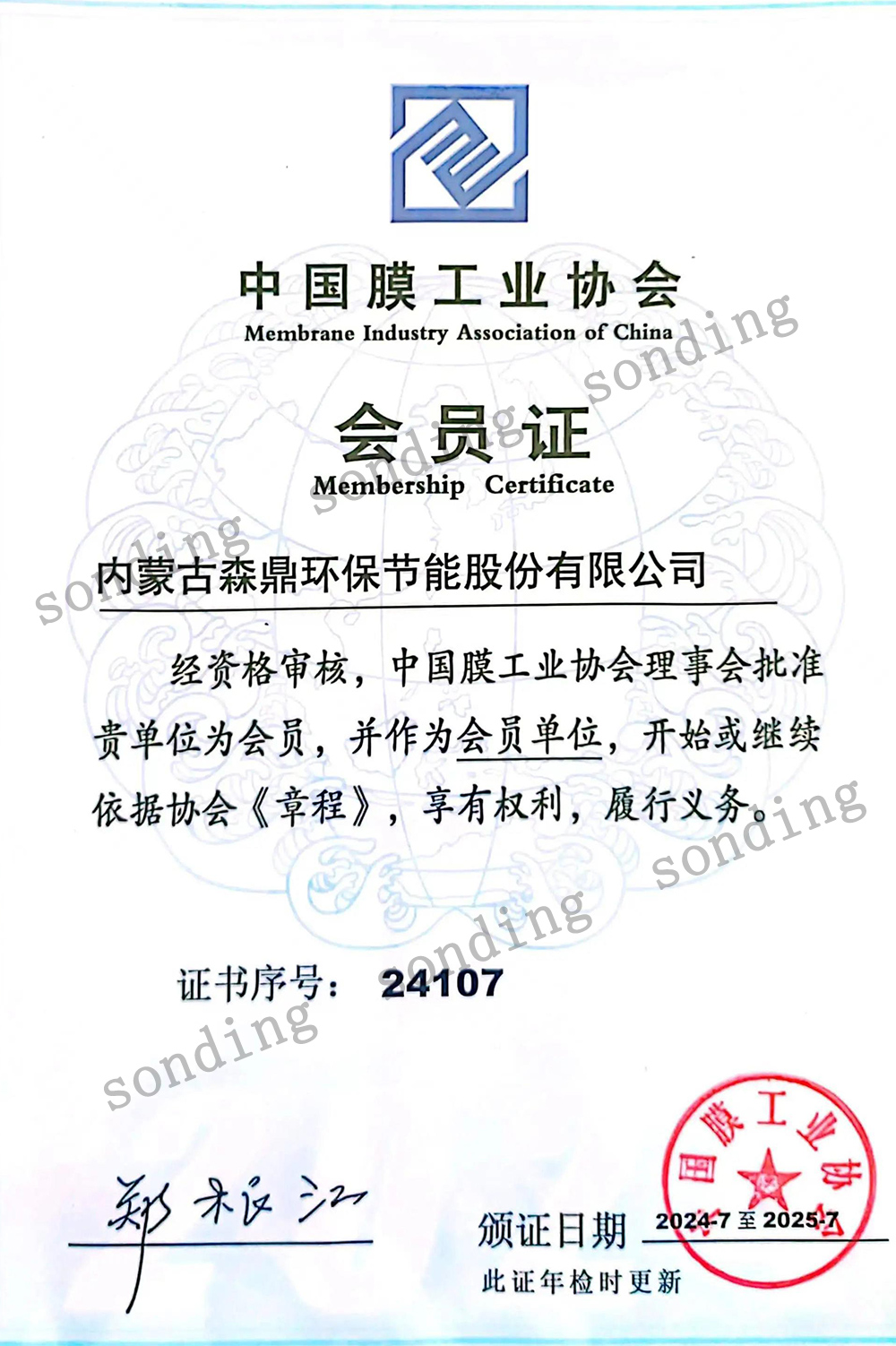 • 中国膜工业协会会员证